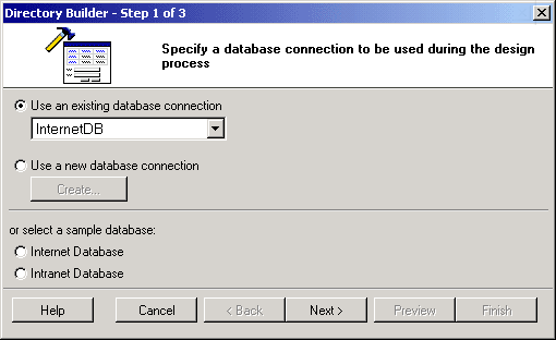 The first step involves selecting or creating a database connection from where the data shown in the directory will be retrieved. You can select one of the existing database connections, create a new connection or select one of the sample databases. Once done click Next to proceed.