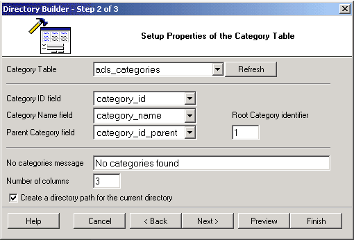 | Category Table | Specify a database table that stores the list of categories to be presented in a directory/index format |