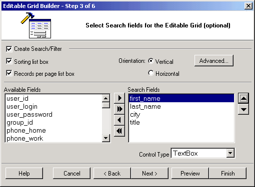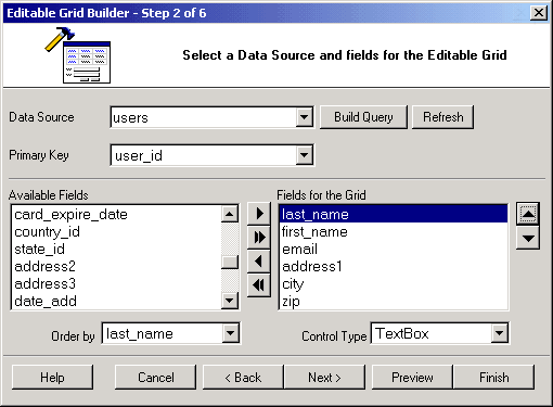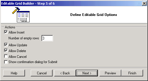 After having added fields to the editable grid and optionally set the Order by field, you can click on the Preview button to see how the editable grid looks like at this point. After previewing the editable grid, close the preview window and click on the Next button to proceed. Note that if you are satisfied with the form at this point, you can click on the Finish button to close the builder and generate the form.