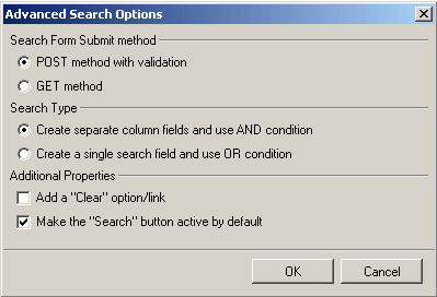 | Advanced... | Click on this button to specify additional features for the search form. You can specify whether the form should be submitted using the POST or GET method. You can also specify whether you want each database field to be represented by a search form field or alternatively have one search form field which can be used to search all database fields using the OR operator. |