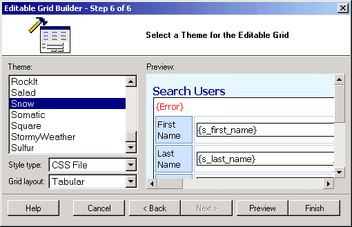 In the final step, you optionally select a theme for the editable grid form. The Preview portion of the window shows how the form would look like with the currently selected theme.