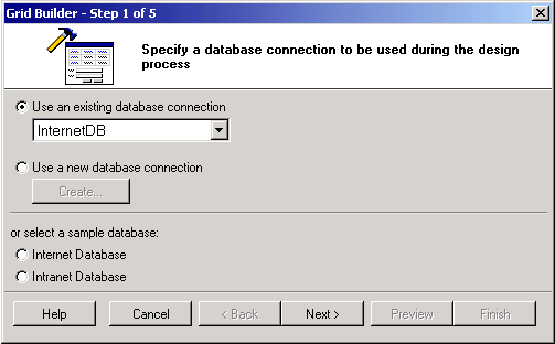 The first step involves selecting or creating a database connection from where the data shown in the grid will be retrieved. You can select one of the existing database connections, create a new connection or select one of the sample databases. Once done click Next to proceed.