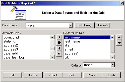Having selected a connection, you now have to select a data source as well as the fields to be included in the grid.
