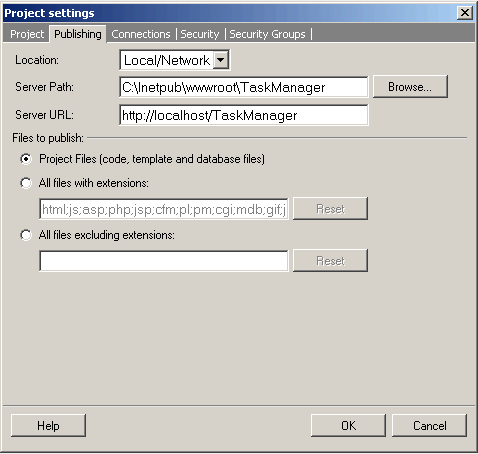For a DSN-less connection, such as to an Microsoft Access database, the server-side database connection has to be configured to reflect the location of the Microsoft Access database on the server. In the case where you know the exact file system location of the database file, you can simply copy the design-time connection string, paste it under the Server tab, and change the file location. For instance, if the Microsoft Access file is located at C:\Inetpub\databases\project1\database.mbd, the corresponding connection string would be: