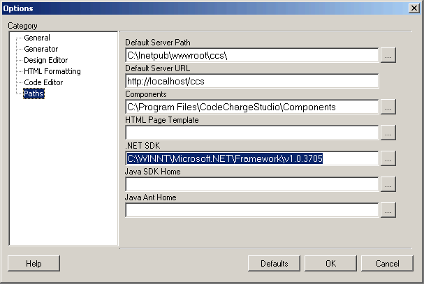 After installing the .Net framework, you need to tell CodeCharge Studio where to find the compilers for C# and VB.Net. To do so, open the Tools | Options... menu and in the Options window, click on the Paths option. In the field entitled .Net SDK, enter the path to the C# or VB.Net compiler file.