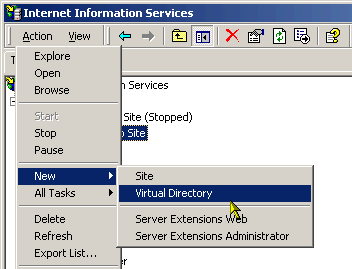To create a virtual folder, open the Internet Information Services Manager and select the site where the project will be published. Then use the Action | New | Virtual Directory menu option to open the Virtual Directory Creation Wizard which will guide you through the steps of creating a virtual directory.