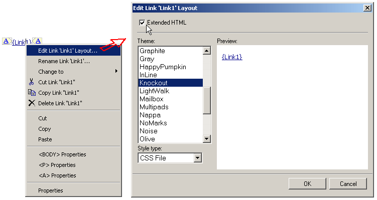 The Extended HTML functionality is provided to allow developers to hide controls dynamically and make their "Visible" property accessible. Once selected, CodeCharge Studio wraps the control into a set of custom tags that make up a custom block, which then can be hidden by using programming code. For example once the "Extended HTML" is applied, the Link may look as follows: