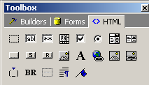 HTML controls are the standard HTML elements as defined in HTML standards and documented in a variety of resources on the Internet, for example at http://www.htmlref.com/reference/AppA/elements.htm. The CodeCharge Studio Toolbox provides a convenient way to add HTML controls to a page, as shown below: