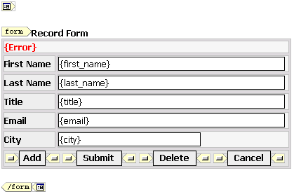 CodeCharge StudioA record form is used to add, edit or delete database content. The record form makes these operations possible by providing three different buttons which can be used to initiate any one of the three operations. Unlike the grid or editable grid forms which are capable of handling multiple records at the same time, the record form can deal with only one database record at a time.