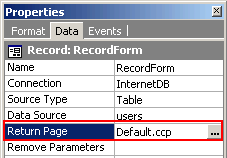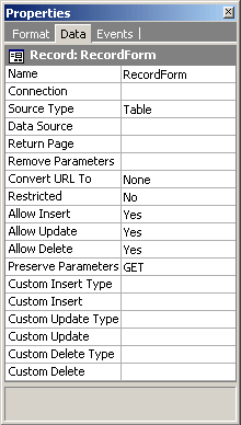 . You can click on either of these glyphs to expose the record form properties under the Data tab of the Properties window. Alternatively, you can click on