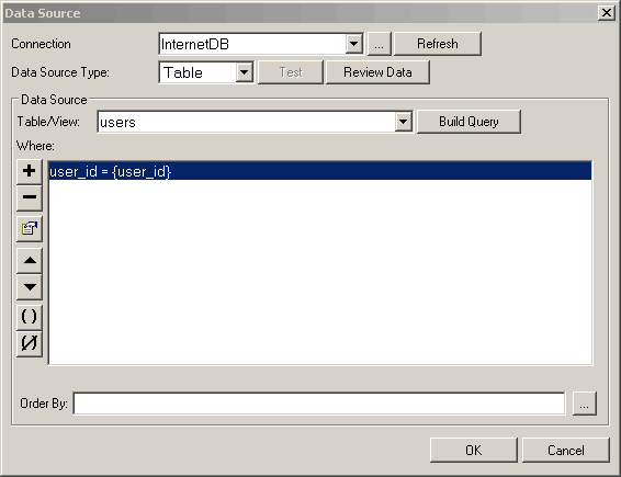 Invariably, all record forms must have at least one input parameter specified under the Where section of the Data Source window. An input parameter must be specified because the record form must receive a primary key value in order for it to retrieve a record. In many cases, the primary key for a table is composed of a single field. However, it is also possible to have a database table which has a complex primary key made up of multiple fields. If the primary key is complex, then the record form should have an input parameter for each of the fields that make up the complex primary key.