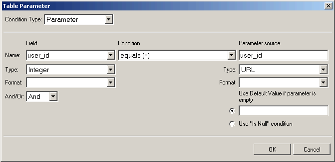 button under the Where section. You can also double-click on an existing input parameter to open the Table Parameter window where it is configured.