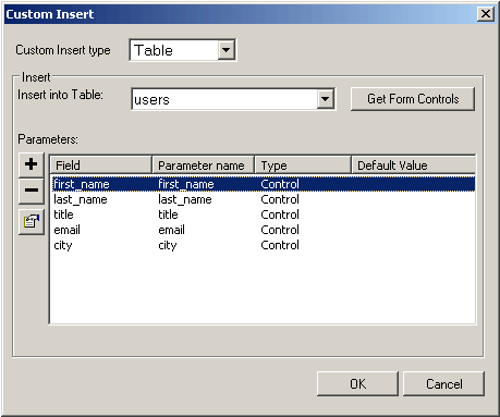 | Custom Insert | Specify the table, SQL query or stored procedure to be used for the custom insert. |