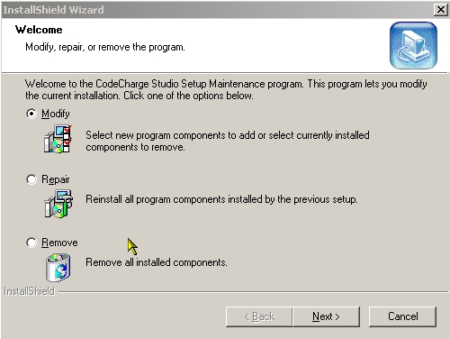 In the window select whether you want to Modify, Repair, or Remove the current CodeCharge Studio installation then click the Next button.