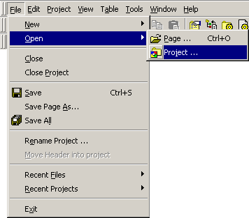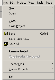 CodeCharge StudioMany of the commands available on the Menu bar can be assessed using keyboard keys rather than using the mouse. This is done by using combination keys that map to particular menu options. Looking at the Menu bar options, notice that each of them has a single letter underlined. Holding down the Alt keyboard key then typing the underlined letter has the same effect as clicking on the menu option concerned. For instance, typing the Alt-F keys will open the File menu shown below.