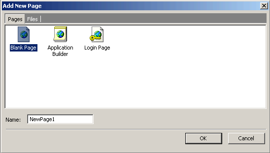 Regardless of the method you use to initiate the process, you will then be presented with the Add New Page dialog which has to two tabs. The first tab called Pages allows you to create CodeCharge Studio pages (.ccp). Using this page you can elect to create: