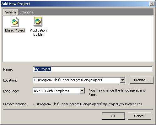 Click OK when all the information is entered. CodeCharge Studio will then create and save the new project on the disk within the specified folder. The project file name will be the same as the project name with the extension .ccs. For example, if your project name is My Project then the file name will be named My Project.ccs. The .ccs file stores the global project settings in XML format, which can be viewed or edited with any XML editor.