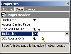 CodeCharge StudioDuring the process of creating a site, there is usually some content that has to appear in every page within the site. For instance, the navigation controls used to access the different pages within the site should appear in each page so that the user can move between pages easily. To provide a uniform and centralized way of including common content into multiple pages, CodeCharge Studio allows pages to be designated as includable. This is done by setting the Includable property for a page to Yes in the page Properties window.