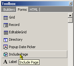 After defining an includable page, you can then include the page within other pages. To do this, open the page where the include page is to be added and place the cursor at the point where the include page should appear. Then click on the Include Page button under the Forms tab of the Toolbox.