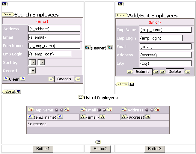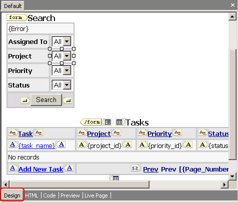 CodeCharge StudioWithin the document window Design mode presents a what-you-see-is-what-you-get (WYSIWYG) representation of an HTML page template. Design mode is suited for adding and manipulating the contents of a page without interacting directly with the underlying HTML code. When working in Design mode, you can use the Builders to add various components to the page as well as drag and drop components from the Toolbox.
