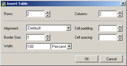 To add a table in Design mode, you can either use the Table | Insert Table... menu option or simple click the Insert Table button in the toolbar. This brings up the Insert Table window where you can configure the properties of the table to be created.