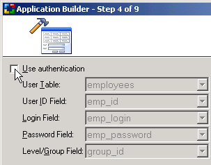 1. Select Use authentication and leave all default options. The Application Builder will then create the Login page and will allow you to specify a security level for each of the pages created.