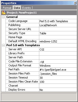 Before publishing a PERL project, there are certain properties that are unique to PERL that need to be configured. To configure these properties click on the project name in the Project Explorer window so that the properties appear under the Data tab of the Properties window.