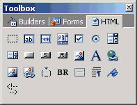 CodeCharge StudioThe HTML Contols listed under the HTML tab of the Toolbox are the standard HTML elements as defined in HTML standards and documented in a variety of resources on the Internet, for example at http://www.htmlref.com/reference/AppA/elements.htm. The CodeCharge Studio Toolbox provides a convenient way to add HTML controls to a page, as shown below:
