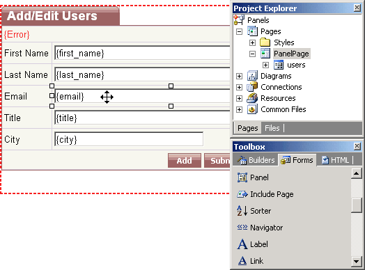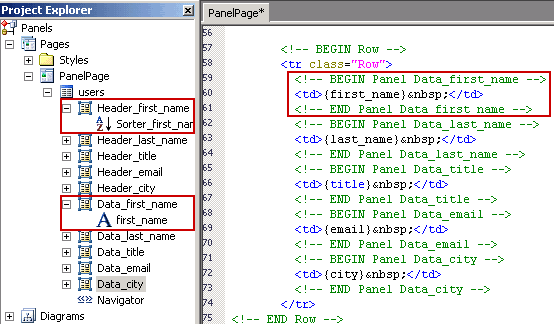 To move parts of HTML code from or into a panel, highlight an HTML snippet and drag it inside or outside the panel.