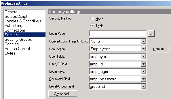 Specify whether the project will have Table based security or no security at all. If you select Table based security, then you also have to specify the table and fields that will be used.