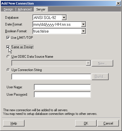Specify that the Server connection is the Same as Design connection. The Server Connection is the database connection utilized by the generated pages to retrieve and update the data. This connection can be different from the Design Connection that is used by the CodeCharge Studio GUI.