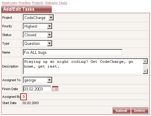 Now let's make one necessary modification on the Task Maintenance page where you might've noticed that the Label field Assigned By doesn't display the employee name, but the ID, as shown below. This is because the tasks table contains only the user ID, while the employees table contains the actual user names.