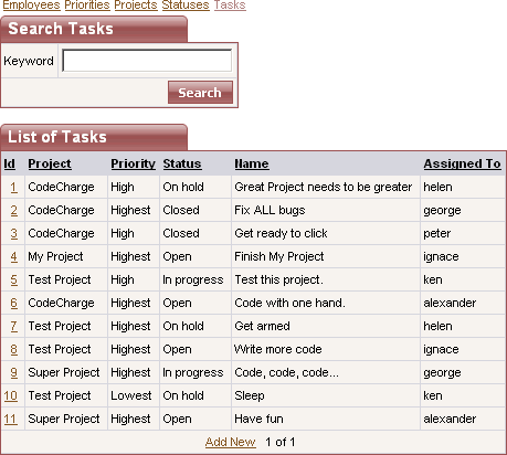 Finally, you can view the working page with a grid containing the list of tasks that can be sorted by clicking on column headings or searched by entering a keyword.