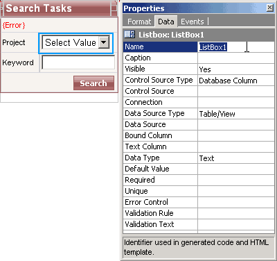 1. Configure the ListBox properties by clicking on it and specifying the required values in the property editor as follows: