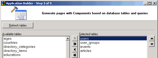 In this step, you select the tables in the database that you want to create pages for.