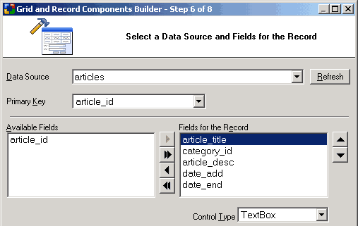 The record form will be based on the same table as was the grid form but you have the option of selecting different fields to appear in the record form. After adding the fields, you should also select the Control Type to be used for each of the fields.