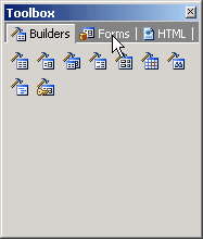 CodeCharge StudioThe Toolbox consists of three tabbed windows featuring a series of commands for adding various components to a page. From Figure 10-11, the toolboxes are described as follows: