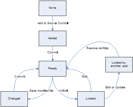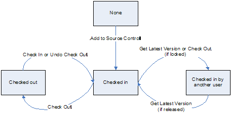 Non-CVS Source Control providers use simpler state transition assuming file is locked exclusively for editing (reserved checkout). Check In operation is used to put new file version into repository and Check Out operation is used to lock file for editing. Current file version can be retrieved using Get Latest Version operation.