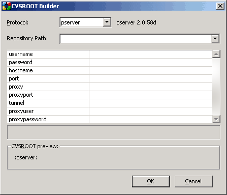 Note: local and fork protocols for accessing local repositories cannot be built using CVSROOT Builder dialog. They need to be typed in the CVS Root textbox directly using the following format: