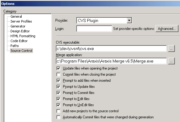 CodeCharge Studio 3.0 integrates with CVS using separate non-Source Control plug-in. The selection of options available for this Source Control provider is slightly different and different wording is used to match CVS concepts. CodeCharge Studio 3.0 uses cvs.exe executable to run CVS commands and the full path to this file needs to be provided. Selecting the Prompt [...] option will display file selection dialog that includes files falling into the operation requested by user. This includes files composing a page or files within a folder.