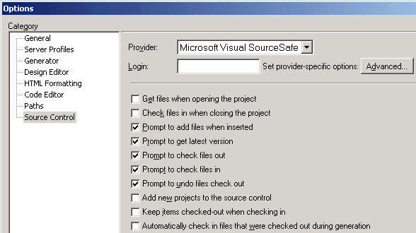 CodeCharge StudioThis dialog contains options that customize how the CodeCharge Studio 3.0 IDE interacts with your chosen source control provider. The selection of options is shared for non-CVS providers. CVS-specific options are described in the next section. Selecting the Prompt [...] option will display file selection dialog that includes files matching the operation requested by the user. This includes files composing a page or files within a folder.