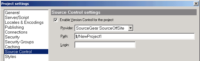 Upon checking Enable Version Control for the project checkbox and choosing SourceGear SourceOffSite in the Provider list-box the following configuration options are available to configure SourceOffSite access: