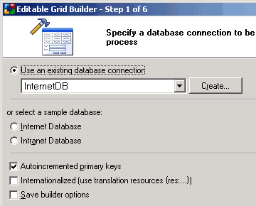 The Autoincremented primary keys checkbox should be activated if the records that will be contained in the Editable Grid will have autoincrement primary keys that are provided automatically by the database. With this option selected, the Editable Grid will not have an editable or submittable control for the primary key since that would result in a database error. Conversely, if primary keys are user provided, then this option should not be selected. In this case, the Editable Grid would have a field where the user can enter a value for the primary key.