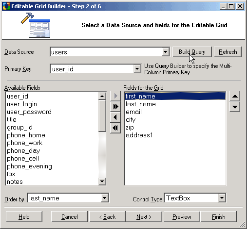 Data Source Select the table or query that contains the fields to be used in the EditableGrid.