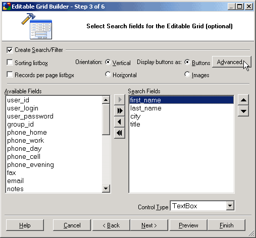 Add a search form that can be used to filter the records displayed in the editable grid form. This step is optional. If you don't want a corresponding search form for the editable grid, you can simply click the Next button to proceed to the next step.
