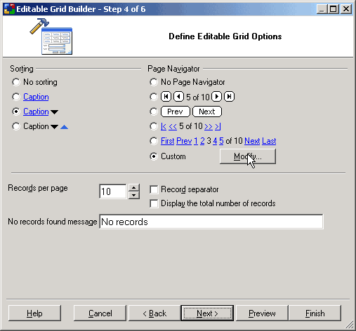 At this juncture, you can further customize the editable grid form by selecting the caption to be used for sorting as well as the navigational controls.