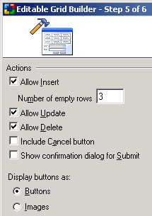 You now have to decide the kind of functionality that will be available in the editable grid form. You can uncheck any of the options if you don't want the form to have the corresponding functionality.