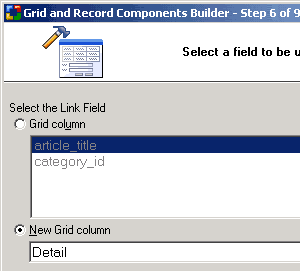 The last step in configuring the grid is selecting the field to be used to link the records in the grid to the details in the record form. You can select any one of the fields that are already in the grid or specify a new column to act as the link to the record form.