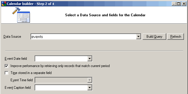 | Data Source | Table(s) for the calendar will be based on. Click Build Query to access the Visual Query Builder and design your database query or enter an SQL query statement. The table or query must contain at least one date or date-time type field. |