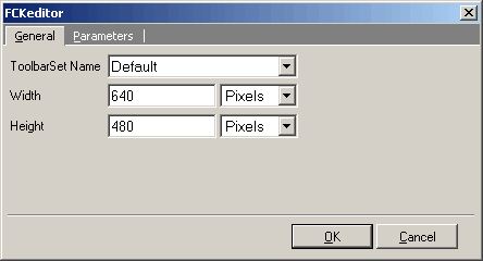 In CCS the FCKeditor can be used by selecting it from the Forms tab of the Toolbox. When selected, the FCKeditor configuration dialog will appear as shown below.